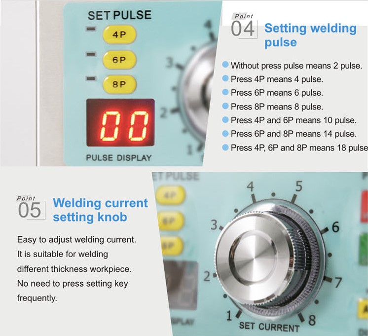- Cuenta con selección de 2, 4, 6 y 8 pulsos de soldadura, lo que garantiza una unión soldada fiable. Se pueden aflojar hasta 18 pulsos.