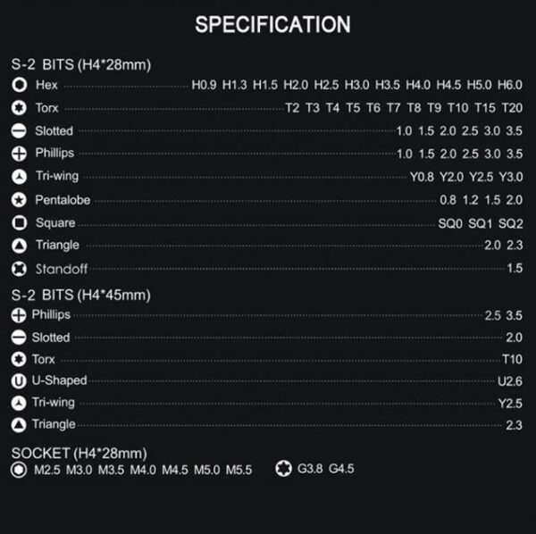 Torx: T2, T3, T4, T5, T6, T7, T8, T9, T10, T15, T20.