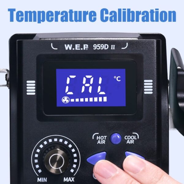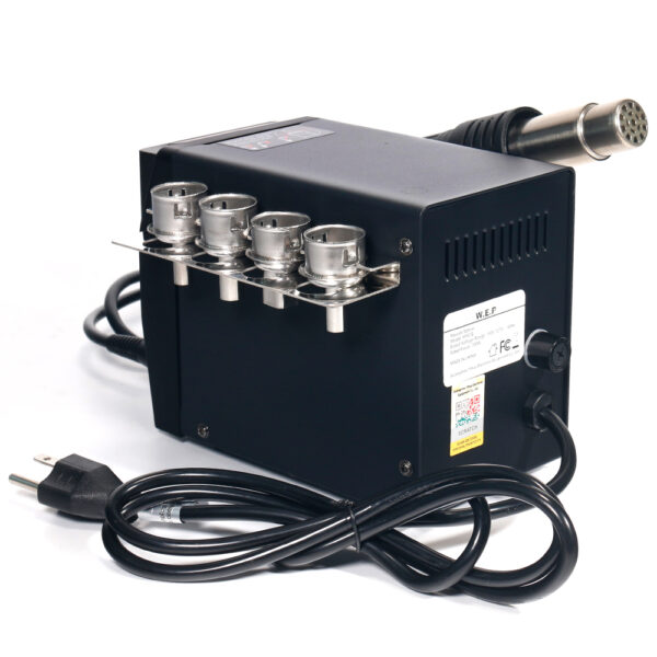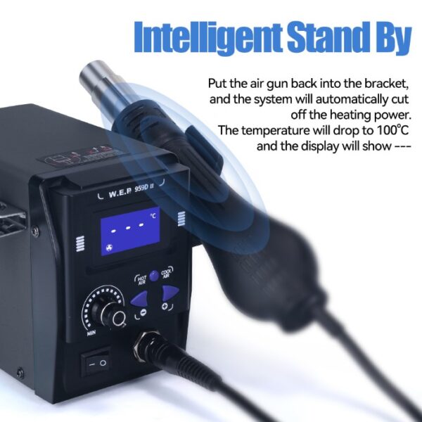 Una función de espera en el soporte para ayudar a enfriar la pistola de aire caliente cuando no está en uso, conservando su pistola de aire caliente en condiciones de menta durante más tiempo. Equipado con la exclusiva pistola de aire caliente WEP con función a prueba de fallos para que su trabajo sea más seguro y evite eficazmente el riesgo de cualquier peligro de incendio.